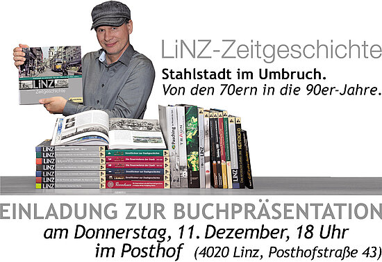 Mit dem aktuellen, neunten Band der Reihe "LiNZ-Zeitgeschichte" führt der Linzer Autor, Verleger und Heimatforscher Manfred Carrington unter dem Titel "Stahlstadt im Umbruch" auf eine faszinierende Zeitreise von den 70er- in die 90er-Jahre, in denen sich Linz neu erfand. Eine Besonderheit bilden die über 500 prägnanten Fotos auf den 248 Seiten. Sie stammen aus dem riesigen Archiv des Pressefotografen Alfred Harrer und spiegeln als visuelles Dokument den Zeitgeist der Stadt in eindrucksvoller Weise wider. Ihre Authentizität macht das Erleben jener Jahre spürbar.  EINTRITT Frei! Mehr Infos und Bestellung