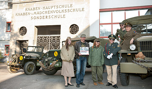 In der Diesterwegschule – dort wo sich vor etwas mehr als sechzig Jahren noch die „Amis“ die Türklinke in die Hand gaben – inszenierte der Linzer Autor und Heimatforscher Manfred Carrington ein Spektakel, das nicht nur Schülern sondern auch Passanten in Erinnerung bleiben wird: Olivgrüne US-Militärfahrzeuge aus den Fünfzigerjahren mit brummenden Motoren, GIs in Uniform und mittendrin Hans-Jörg „Fatsy“ Razenböck in amerikanischer Generalsmontur. Der Anlass: Die Neuerscheinung des Buches „Koks und Cola. Linz in den Fünfzigerjahren“. Auf 248 großformatigen Seiten lässt das Werk jenes Stück Linzer Stadtgeschichte in großartigen Bildern wieder aufleben.