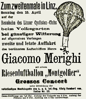 Im Jahr 1894 besuchte schließlich auch der italienische Luftschiffer Giacomo Merighi mit seinem Ballon „Montgolfier“ zweimal Linz. Unter seinem Riesenballon mit einem Durchmesser von 25 m befand sich jedoch kein Korb, sondern ein doppeltes Trapez auf dem er Kunststücke vorführte. Tausende Linzer beobachten damals seine Vorführung. Fünf Jahre später verunglückte er bei einer Vorführung in Graz als sein Ballon in 3.500 m Höhe platzte. Am 30. Oktober 1909 begeisterten auf dem Linzer Südbahnhof wiederum die Brüder Alexander und Anatol Renner mit ihrem „Estarie I“, dem ersten in Österreich erbauten Lenkballon, nachdem er sich in die Lüfte erhoben hatte und einen Rundflug über Linz vollführte.